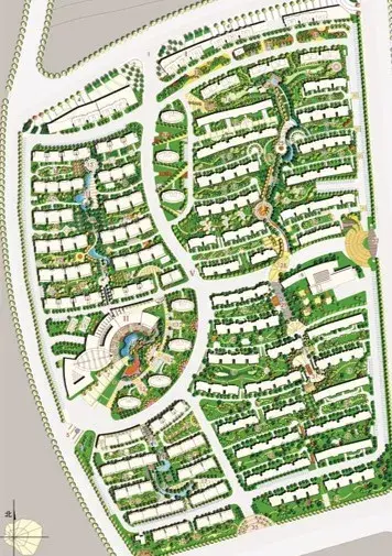 用地中間做環(huán)形道路,向外引出錯落的分支道路,形成各自獨立的組團,中心適宜做景觀。
