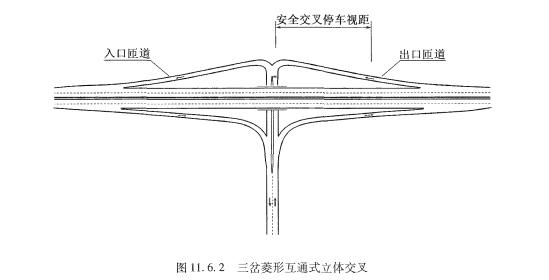 《規(guī)范》11.6.2條規(guī)定,菱形或苜蓿葉互通中的兩個平面交叉宜相互通視,凸曲線應(yīng)保證停車視距,間距應(yīng)容納兩個左轉(zhuǎn)車道,不宜設(shè)置人行橫道。