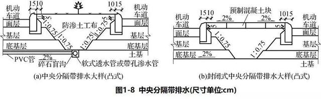 中央分隔帶的排水設(shè)施由排水溝(明溝、暗溝)、滲溝、雨水井、集水井、橫向排水管等組成。中央分隔帶可采用凸式(見(jiàn)圖1-8)、平式或凹式,一般不封閉,但也可封閉。