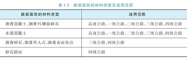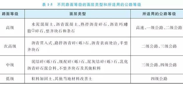 路面等級(jí)分為高級(jí)、次高級(jí)、中級(jí)和低級(jí),不同路面等級(jí)的面層類型和所適用的公路等級(jí)見(jiàn)表1-5。