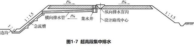 對(duì)于新建高速公路超高段的集中排水,宜采用在左側(cè)路緣帶的左側(cè)設(shè)置帶有鋼筋混凝土蓋板的預(yù)制整體式U形混凝土溝或縫隙式排水溝,每25~50 m設(shè)一處集水井,并通過(guò)橫向排水管引至邊坡的急流槽或暗管中,如圖1-7所示。