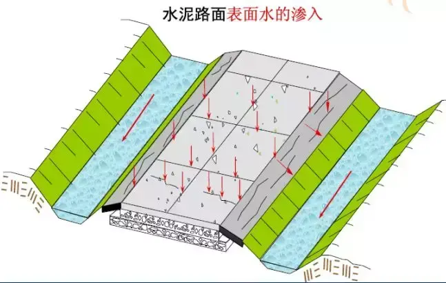 路面結(jié)構(gòu)內(nèi)部水的危害:浸濕各結(jié)構(gòu)層材料和路基土,易造成無粘結(jié)粒狀材料和地基土的強度降低;使水泥混凝土路面產(chǎn)生唧泥,隨之出現(xiàn)錯臺、開裂和整個路肩破壞;進入空隙的自由水在行車荷載的作用下,會形成高孔隙水壓力和高流速的水流,引起路面基層的細顆粒產(chǎn)生唧泥,結(jié)果失去支承;在冰凍深度大于路面厚度的地方,高地下水位會造成凍脹,并在凍融期間降低承載能力;水使凍脹土產(chǎn)生不均勻凍脹;與水經(jīng)常接觸將使瀝青混合料剝落,影響瀝青混凝土耐久性和產(chǎn)生龜裂。