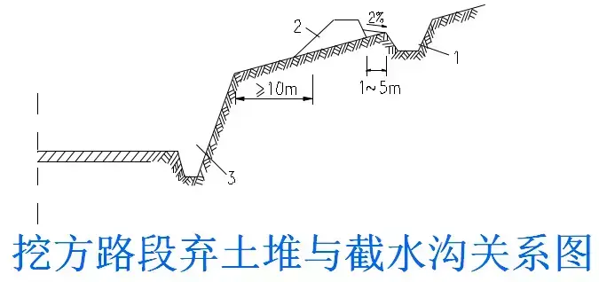 2.截水溝:又稱天溝,一般設置在挖方路基邊坡坡頂以外,或山坡路堤上方的適當?shù)攸c,用以攔截并排除路基上方流向路基的地面徑流。