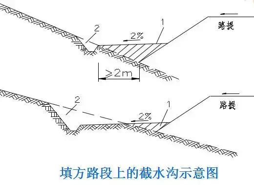 (1)橫向位置:截水溝一般布置在路塹邊坡或陡坡路堤上側(cè),垂直于山坡水流方向或基本與等高線平行。視降雨量,可以不設或設計多道。