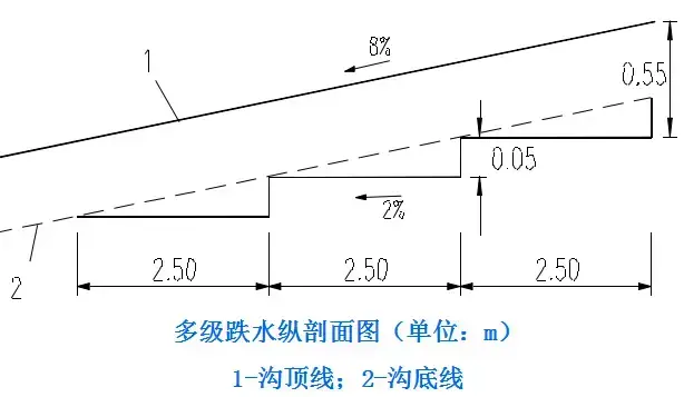 4.跌水與急流槽:跌水與急流槽是路基地面排水溝渠的特殊形, 用于陡坡地段,溝底縱坡可達45度。在陡坡或深溝地段設置的溝底為階梯,水流呈瀑布式跌落的溝槽稱作跌水。跌水的作用是在較短的距離內(nèi),降低水流流速,消減水流能量,進而防止沖刷(用于坡度大于10%,水頭高差大于1.0m的陡坡地段)