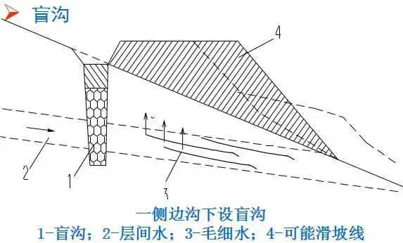 7.盲溝:相對于地面排水的明溝而言,盲溝又稱為暗溝,是一種隱蔽工程。在溝內(nèi)填以大小不同的顆粒材料,利用滲水材料的透水性將地下水匯集與溝內(nèi),并沿溝排泄至指定地點。