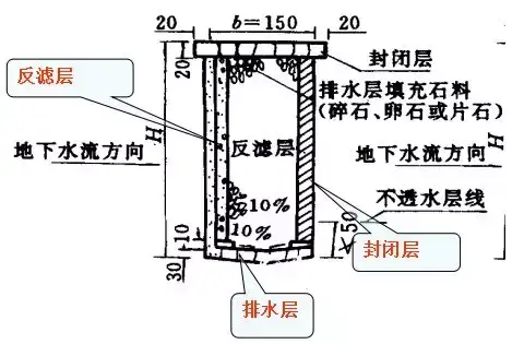 滲溝構(gòu)造:由排水層(石縫,管,洞),反濾層和封閉層所組成。封閉層:防止地面水的下滲(漿砌片石)。反濾層:匯集水流,防止水層中的土粒堵塞排水層,由大小均勻的砂石材料,分層填埋。