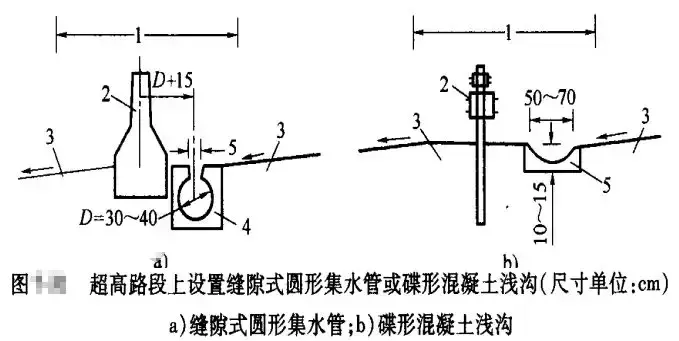 (1)寬度小于3m且表面采用鋪面封閉的中央分隔帶排水,降落在分隔帶上的表面水排向兩側(cè)行車道,其坡度與路面的橫坡度相同;在超高路段上,可在分隔帶上側(cè)邊緣處設置緣石或泄水口,或者在分隔帶內(nèi)設置縫隙式圓形集水管或碟形混凝土淺溝和泄水口,以攔截和排泄上側(cè)半幅路面的表面水。緣石過水斷面的泄水口可采用開口式,格柵式或組合式;碟形混凝土淺溝的泄水口采用格柵式。