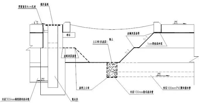 (2)寬度大于3m且表面未采用鋪面封閉的中央分隔帶排水,降落在分隔帶上的表面水匯集在分隔帶中央的低洼處,并通過縱坡排流到泄水口或橫穿路界的橋涵水道中。