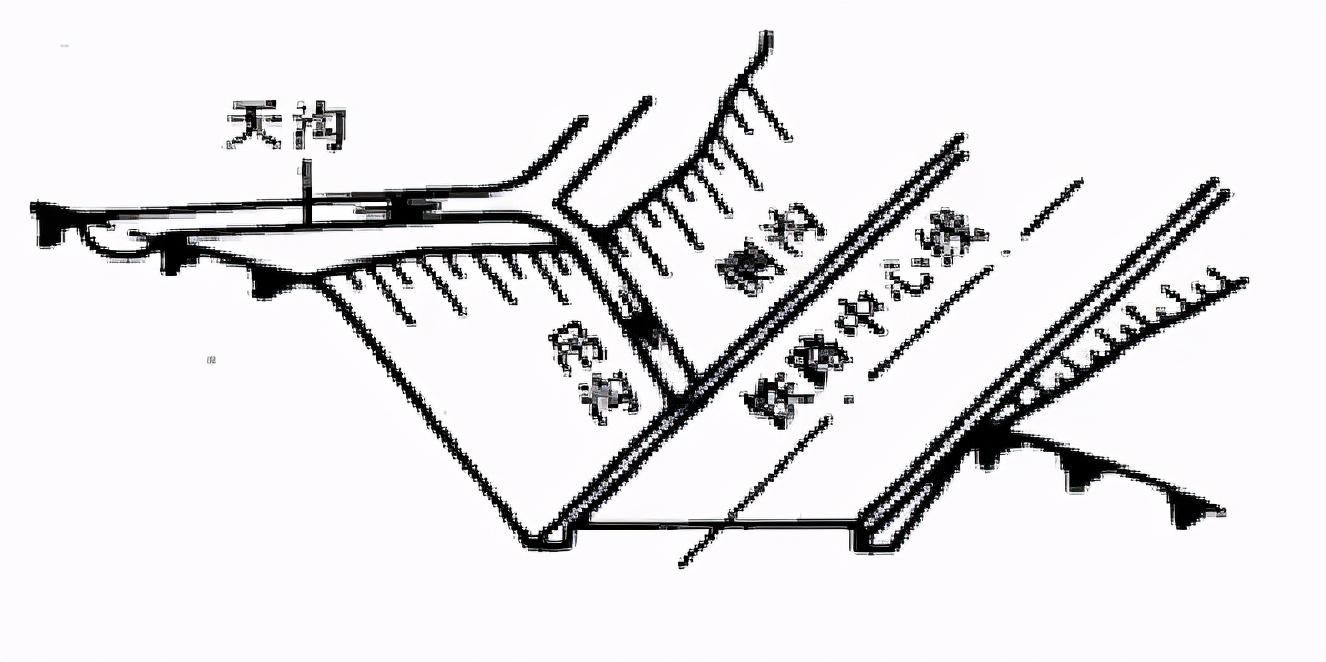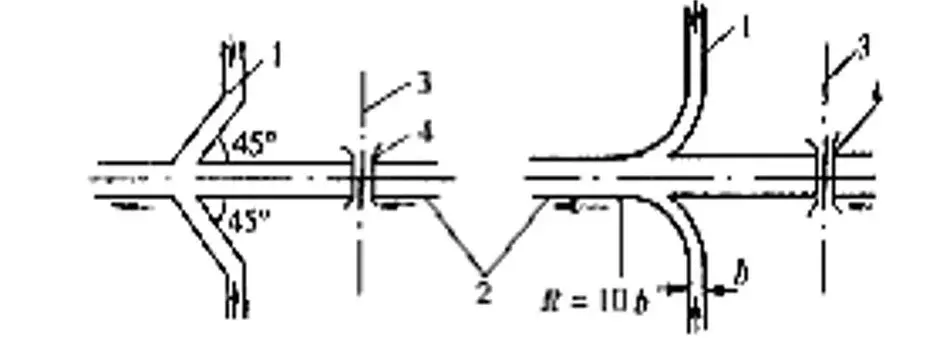 排水溝與其他溝渠相接時(shí)應(yīng)力求水流舒順,因地形限制成直角相交時(shí),可按下圖形式處置: