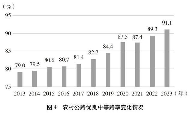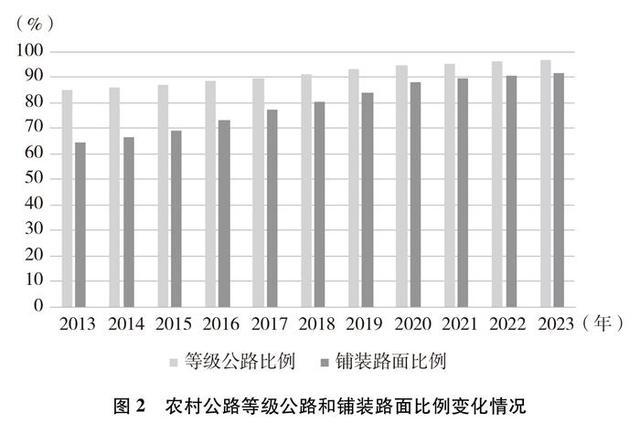 技術(shù)等級(jí)逐年提高。截至2023年底,農(nóng)村公路等級(jí)路②里程及比例分別達(dá)到445萬(wàn)公里和96.8%,鋪裝路面里程及比例分別達(dá)到422萬(wàn)公里和91.8%,十年間分別提高了11.9個(gè)百分點(diǎn)、27.2個(gè)百分點(diǎn)。