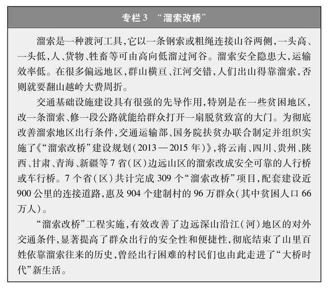 解決特殊地區(qū)出行難題。改一條溜索、修一段公路就能給群眾打開(kāi)一扇脫貧致富的大門。為了保障偏遠(yuǎn)山區(qū)百姓安全出行,推動(dòng)“溜索改橋”建設(shè),專項(xiàng)資金支持、精心組織實(shí)施,用3年時(shí)間徹底改善了溜索地區(qū)出行條件(專欄3)。推進(jìn)“直過(guò)民族”③和人口較少民族聚居區(qū)農(nóng)村公路建設(shè),解決民族地區(qū)交通閉塞的突出問(wèn)題,加快民族地區(qū)脫貧致富步伐。
