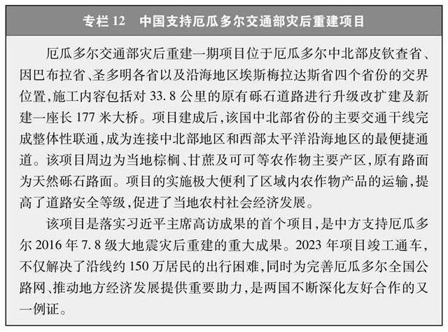 中國(guó)積極支持并參與發(fā)展中國(guó)家的農(nóng)村公路建設(shè)項(xiàng)目,在其他發(fā)展中國(guó)家援建了大批農(nóng)村公路基礎(chǔ)設(shè)施項(xiàng)目,向世界農(nóng)村公路領(lǐng)域分享中國(guó)方案、中國(guó)經(jīng)驗(yàn)。通過(guò)參與項(xiàng)目建設(shè)、提供技術(shù)支持和人力資源,幫助當(dāng)?shù)馗纳妻r(nóng)村地區(qū)道路基礎(chǔ)條件(專欄12),極大方便當(dāng)?shù)厝嗣癯鲂校蠓冉档臀锪鞒杀?,增?qiáng)城鄉(xiāng)互動(dòng),促進(jìn)當(dāng)?shù)剞r(nóng)產(chǎn)品的流通和市場(chǎng)接入,對(duì)消減貧困、改善民生、提升人民群眾的生活水平,促進(jìn)當(dāng)?shù)亟?jīng)濟(jì)社會(huì)發(fā)展具有重要意義,深受當(dāng)?shù)匕傩蘸迷u(píng),如中國(guó)無(wú)償援建的馬達(dá)加斯加首都郊區(qū)公路項(xiàng)目,便利了馬哈扎扎鎮(zhèn)雞蛋運(yùn)輸,促進(jìn)了當(dāng)?shù)氐半u養(yǎng)殖業(yè)發(fā)展,這條路被當(dāng)?shù)厝擞H切地稱作“雞蛋路”。
