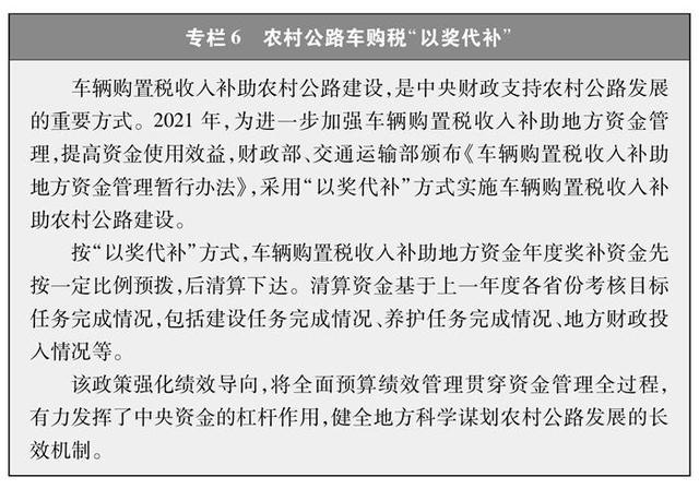 規(guī)范高效用好農(nóng)村公路發(fā)展資金。完善車輛購(gòu)置稅補(bǔ)助地方資金轉(zhuǎn)移支付制度,利用“以獎(jiǎng)代補(bǔ)”方式支持農(nóng)村公路建設(shè)(專欄6),對(duì)各級(jí)財(cái)政用于農(nóng)村公路的資金實(shí)施全過(guò)程預(yù)算績(jī)效管理,提高農(nóng)村公路資金使用效益,加強(qiáng)農(nóng)村公路資金使用監(jiān)管,給資金戴上“緊箍咒”。在資金管理和使用上建立“誰(shuí)申報(bào)誰(shuí)負(fù)責(zé)”“誰(shuí)使用誰(shuí)負(fù)責(zé)”的責(zé)任機(jī)制,確保資金實(shí)際足額撥付到位,并按有關(guān)規(guī)定向社會(huì)公開(kāi),接受群眾監(jiān)督。加強(qiáng)農(nóng)村公路債務(wù)風(fēng)險(xiǎn)防控,依法合規(guī)籌措債務(wù)資金。