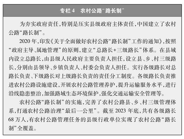 完善政策制度。出臺(tái)《關(guān)于推動(dòng)“四好農(nóng)村路”高質(zhì)量發(fā)展的指導(dǎo)意見(jiàn)》等20余項(xiàng)政策文件,建立覆蓋體制、機(jī)制、組織、監(jiān)管、資金、考核、服務(wù)等領(lǐng)域的農(nóng)村公路政策制度體系。把責(zé)任制作為管理的重中之重,出臺(tái)《關(guān)于深化農(nóng)村公路管理養(yǎng)護(hù)體制改革的意見(jiàn)》,確立省、市級(jí)政府加強(qiáng)統(tǒng)籌和指導(dǎo)監(jiān)督、縣級(jí)政府履行主體責(zé)任,建立縣級(jí)相關(guān)部門、鄉(xiāng)級(jí)政府農(nóng)村公路管理養(yǎng)護(hù)權(quán)力和責(zé)任清單,形成上下聯(lián)動(dòng)、密切配合、齊抓共管的工作局面。建立農(nóng)村公路“路長(zhǎng)制”(專欄4),由縣、鄉(xiāng)兩級(jí)行政負(fù)責(zé)人和村(居)委員會(huì)負(fù)責(zé)人擔(dān)任路長(zhǎng),實(shí)現(xiàn)跨部門協(xié)同,推動(dòng)政府主體責(zé)任高效落實(shí),使農(nóng)村公路管理逐步從粗放向精準(zhǔn)、從被動(dòng)向主動(dòng)、從單打獨(dú)斗向齊心協(xié)力轉(zhuǎn)變。
