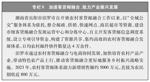 加快推進(jìn)農(nóng)村客貨郵融合發(fā)展。為統(tǒng)籌解決農(nóng)村客運(yùn)可持續(xù)運(yùn)營(yíng)、快遞下鄉(xiāng)進(jìn)村和農(nóng)產(chǎn)品出村進(jìn)城難題,發(fā)布《關(guān)于加快推進(jìn)農(nóng)村客貨郵融合發(fā)展的指導(dǎo)意見(jiàn)》,堅(jiān)持“政府引導(dǎo)、市場(chǎng)主導(dǎo)”,深入推進(jìn)農(nóng)村客貨郵運(yùn)行機(jī)制、基礎(chǔ)設(shè)施、運(yùn)輸線路、運(yùn)營(yíng)信息等共建共享,加強(qiáng)資源統(tǒng)籌利用,推動(dòng)融合發(fā)展(專欄8)。截至2023年底,所有省份和超70%地級(jí)以上城市建立了交通運(yùn)輸、郵政、商務(wù)、供銷等部門共同參與的工作機(jī)制,共開(kāi)通農(nóng)村客貨郵合作線路1.1萬(wàn)余條,共建成縣、鄉(xiāng)、村三級(jí)客貨郵服務(wù)站點(diǎn)9萬(wàn)余個(gè),形成“客運(yùn)郵路”“貨郵同網(wǎng)”等典型模式,有效鞏固了通客車成果,農(nóng)村物流、郵政快遞降本增效取得明顯進(jìn)展,帶動(dòng)了農(nóng)村電商、特色產(chǎn)業(yè)等蓬勃發(fā)展。