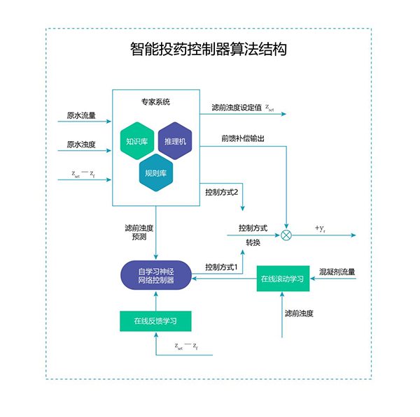 首先通過前饋專家模型采集分析源水流量、濁度、 PH 值 等數(shù)據(jù)信息并快速建模,再利用人工神經(jīng)網(wǎng)絡(luò)對(duì)模型進(jìn)行深度學(xué)習(xí),通過多步預(yù)測、滾動(dòng)優(yōu)化和反饋校正識(shí)別出加藥量和變量之間的對(duì)應(yīng)關(guān)系,最終得出最精準(zhǔn)的藥劑投加量?;苍浦悄芗铀幭到y(tǒng)可通過軟件平臺(tái)對(duì)工藝過程進(jìn)行全自動(dòng)監(jiān)控、診斷,投藥全程自動(dòng)化控制,設(shè)備故障自動(dòng)進(jìn)行切換控制;實(shí)現(xiàn)對(duì)設(shè)備運(yùn)行、藥劑消耗、水質(zhì)監(jiān)控等方面進(jìn)行實(shí)時(shí)診斷、數(shù)據(jù)分析、故障預(yù)測及報(bào)警 。